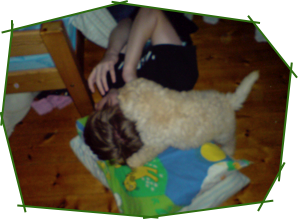 Muffin kittlar Max så han vrider sig av skratt. Hon slickas i öronen. Han har ingen chans.